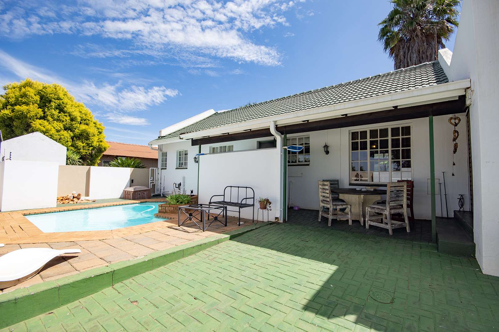 Tucked away in a well-established and beautifully maintained complex in Bergsig, this charming three-bedroom townhouse offers the perfect blend of comfort, community, and surprisingly generous space. From the moment you arrive, you’ll feel the warmth of a neighbourhood where friendly faces and a strong sense of community create a peaceful and secure environment. Here, you enjoy the best of both worlds — your own private sanctuary, with the added reassurance of neighbours close by. The complex itself is neat and thoughtfully laid out, with additional guest parking making entertaining effortless. Positioned as a sought-after corner unit, this home boasts one of the largest stands in the complex — a rare find that truly sets it apart. The front garden offers open, versatile space that could easily be enclosed to suit your needs, whether for pets, children, or simply added privacy. Being pet-friendly, this home welcomes your furry companions to enjoy the outdoors just as much as you will. Step inside to a well-designed layout featuring a comfortable living area and a dining space that flows seamlessly from the kitchen. The kitchen is practical and inviting, fitted with built-in cupboards, a stove, basin, and a convenient serving window that connects you to the dining area — perfect for easy everyday living. All three bedrooms are generously sized and fitted with built-in cupboards, ensuring ample storage throughout. The home offers two bathrooms: a neat, modern family bathroom with a bathtub, basin, and toilet, and a private en-suite to the main bedroom complete with a shower, basin, and toilet — giving you the flexibility of both quick mornings and relaxing evenings. But the true heart of this home lies beyond its doors… The backyard is an absolute hidden gem — a private oasis that will capture your heart the moment you step outside. Fully paved for low maintenance, this expansive space is far larger than expected, offering both functionality and charm. A covered patio invites relaxed outdoor dining and weekend gatherings, while the sparkling splash pool adds a refreshing touch for warm summer days. It’s a space designed for making memories — whether entertaining friends or simply unwinding in your own peaceful retreat. Completing the picture is a garage and a carport, providing secure parking for two vehicles. This is more than just a townhouse — it’s a home that surprises, welcomes, and invites you to stay.