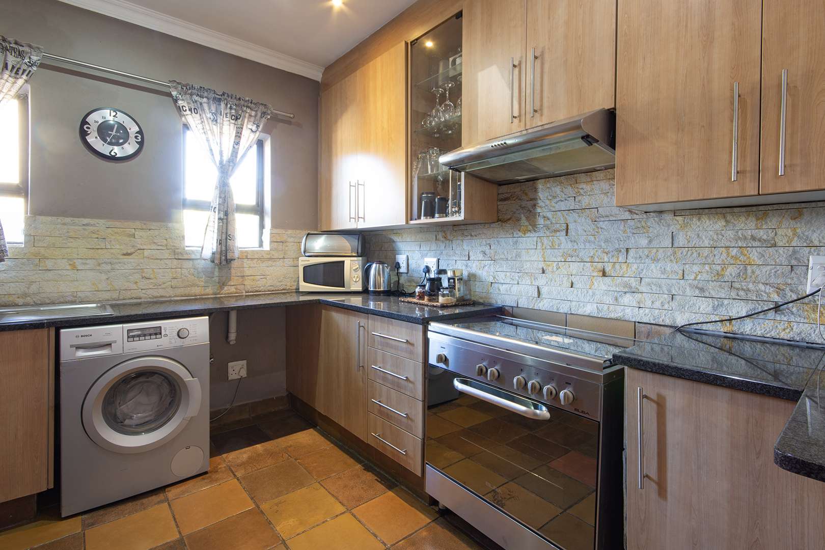 • Kitchen with granite countertops, freestanding gas hob and electric oven and connections for a dishwasher and a washing machine.