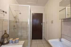 Outdoor living is equally impressive, with an entertainment area featuring a grass-roof lapa and built-in braai—ideal for relaxed social occasions. The beautifully maintained front and back gardens provide a serene backdrop, while practical extras include a washing line and a zinc storage shed for garden equipment.