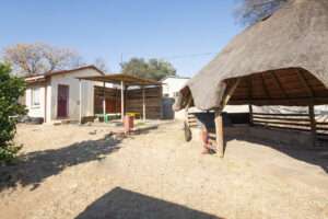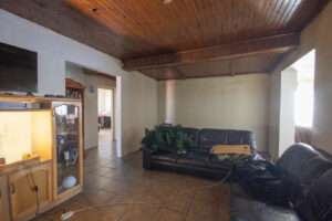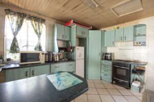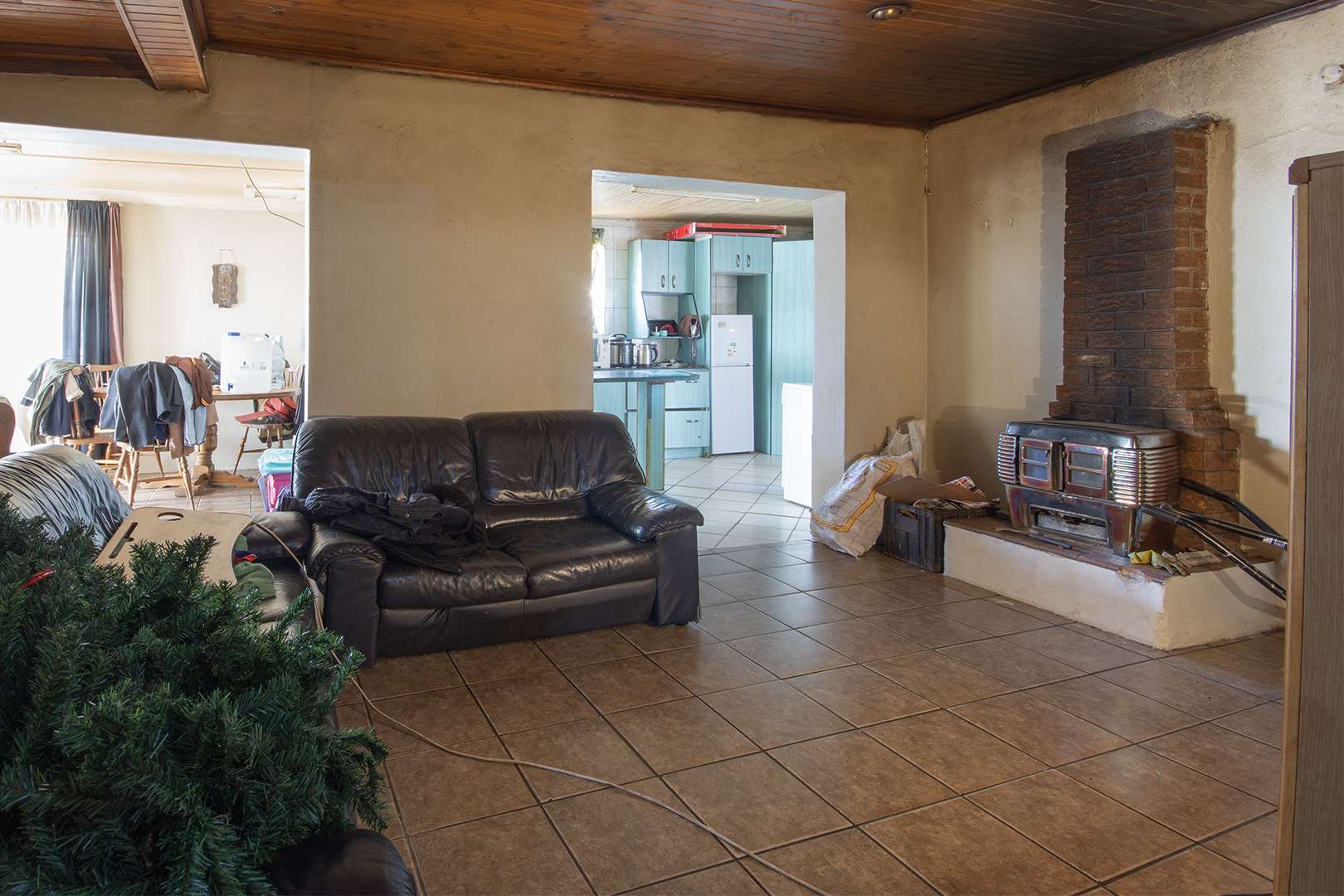 The main house welcomes you with a spacious open-plan layout, combining the living room, dining room, and kitchen in a flowing, functional design. The lounge features a cozy fireplace—ideal for those chilly winter evenings—while tiled floors throughout add a touch of practicality and low-maintenance living.