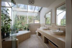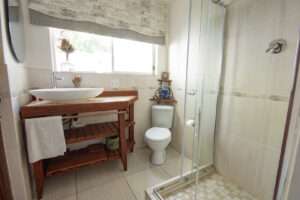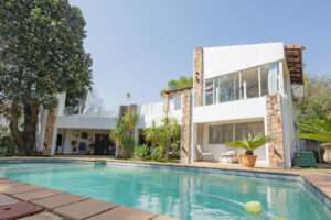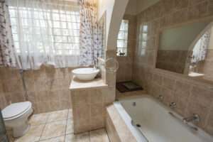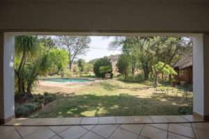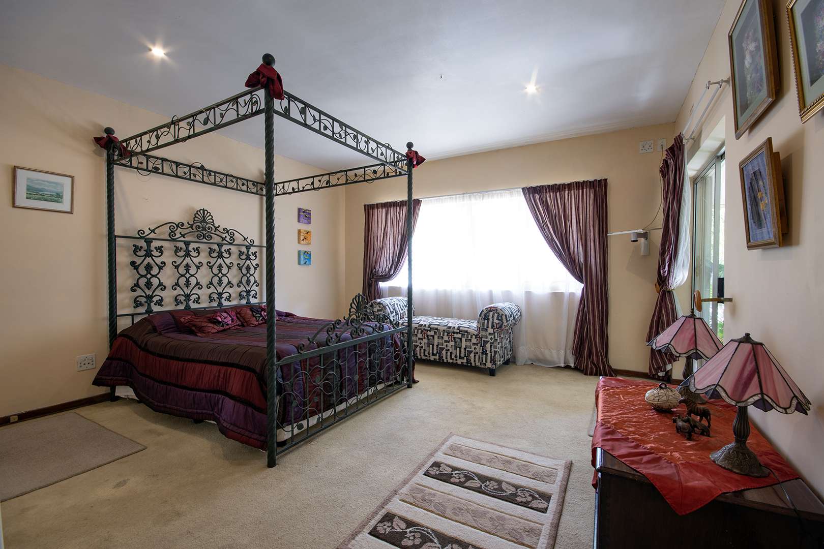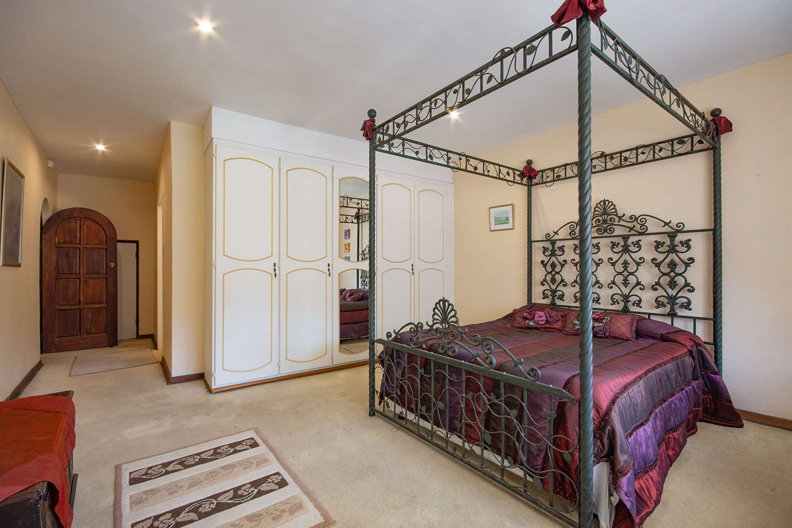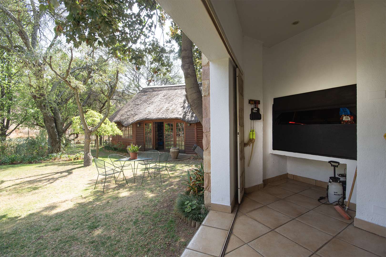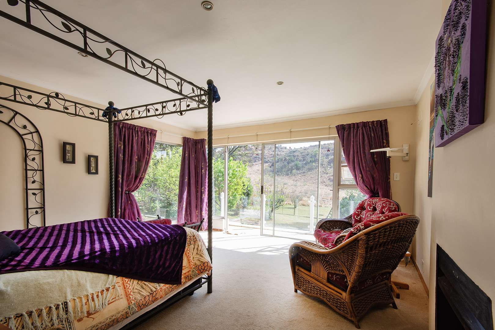The bedroom accommodation is equally impressive. Each of the five spacious bedrooms offers built-in cupboards and access to a bathroom, with four enjoying en-suite convenience. Completely private, the show-stopping master suite includes its own fireplace, spa-like en-suite with Jacuzzi and skylight, plus a private balcony with spectacular views of the garden, pool and koppie. An additional upstairs bedroom that can also be used as part of the main bedroom also features a fireplace and sliding doors opening onto a balcony, creating the perfect retreat.