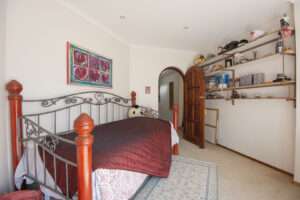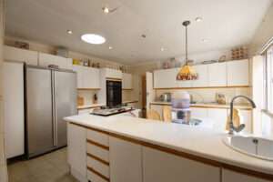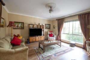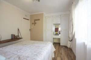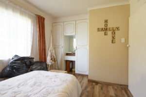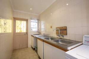 At the heart of the home lies the fully equipped kitchen, complete with an electric stove, eye-level oven, space for a double-door fridge, and a separate scullery with full appliance connections. Direct access from the garage adds to the home’s practicality.