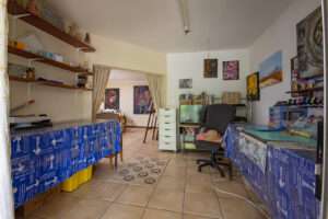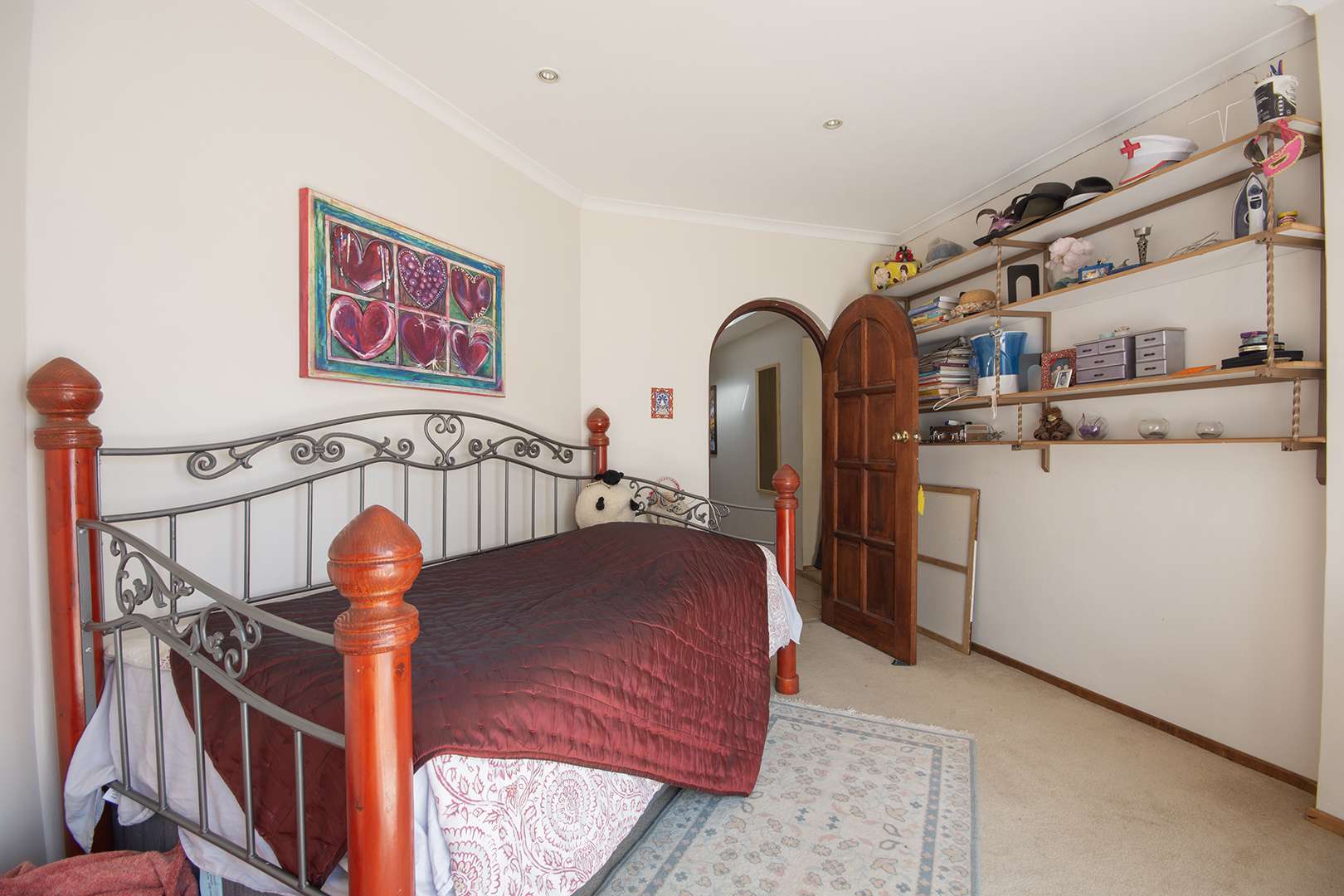 Practical features abound: a double garage (one tandem) with space for three cars, secure covered parking for additional vehicles or a caravan with private entrance from the street, and a separate storeroom/workshop. A 15,000-litre underground steel water tank, powered by a borehole and connected to the irrigation system, ensures a reliable water supply year-round.