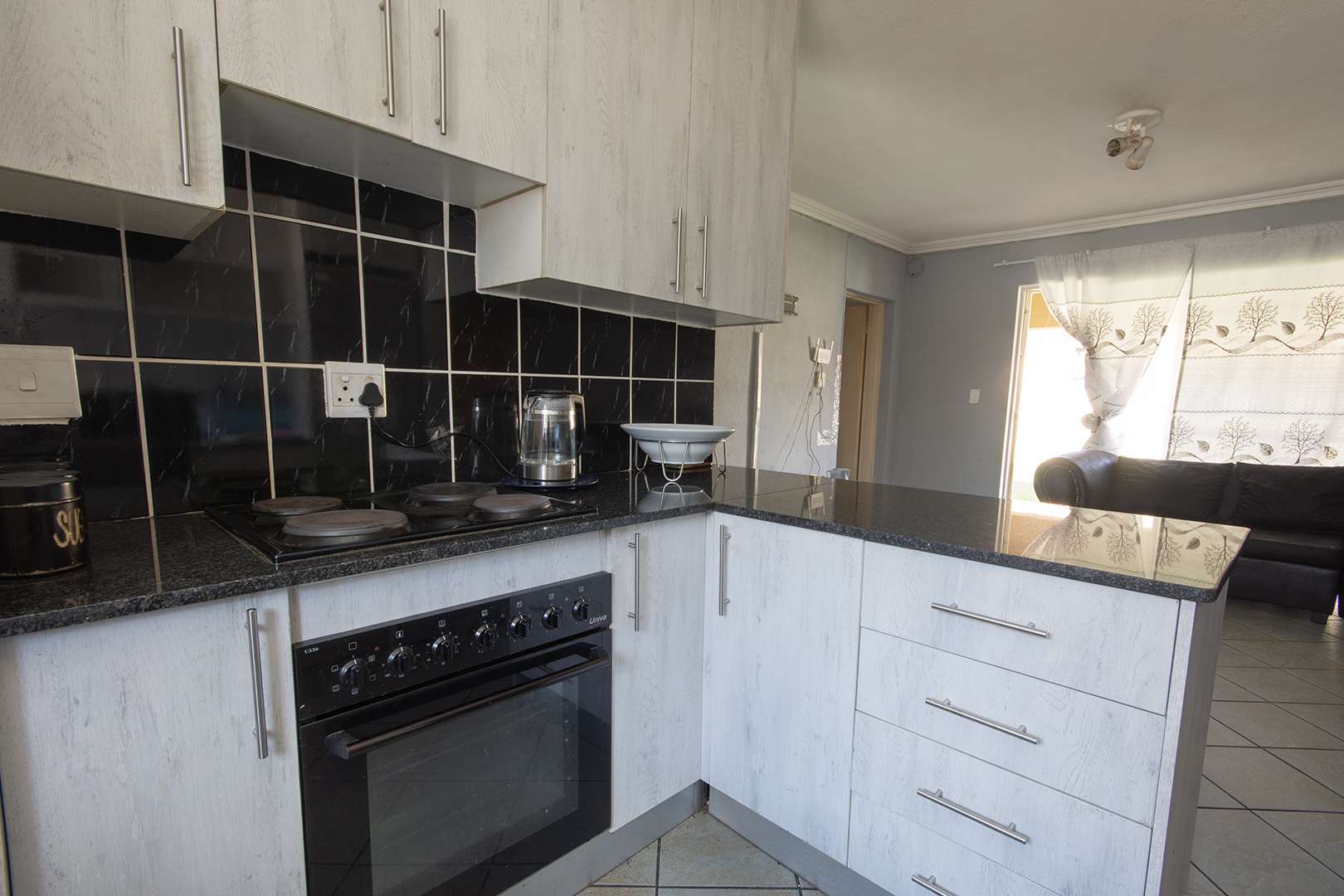 The kitchen is open plan to the lounge, creating a comfortable and practical living space. It is fitted with an electric stove and under-counter oven, and also provides a connection point for either a washing machine or dishwasher.