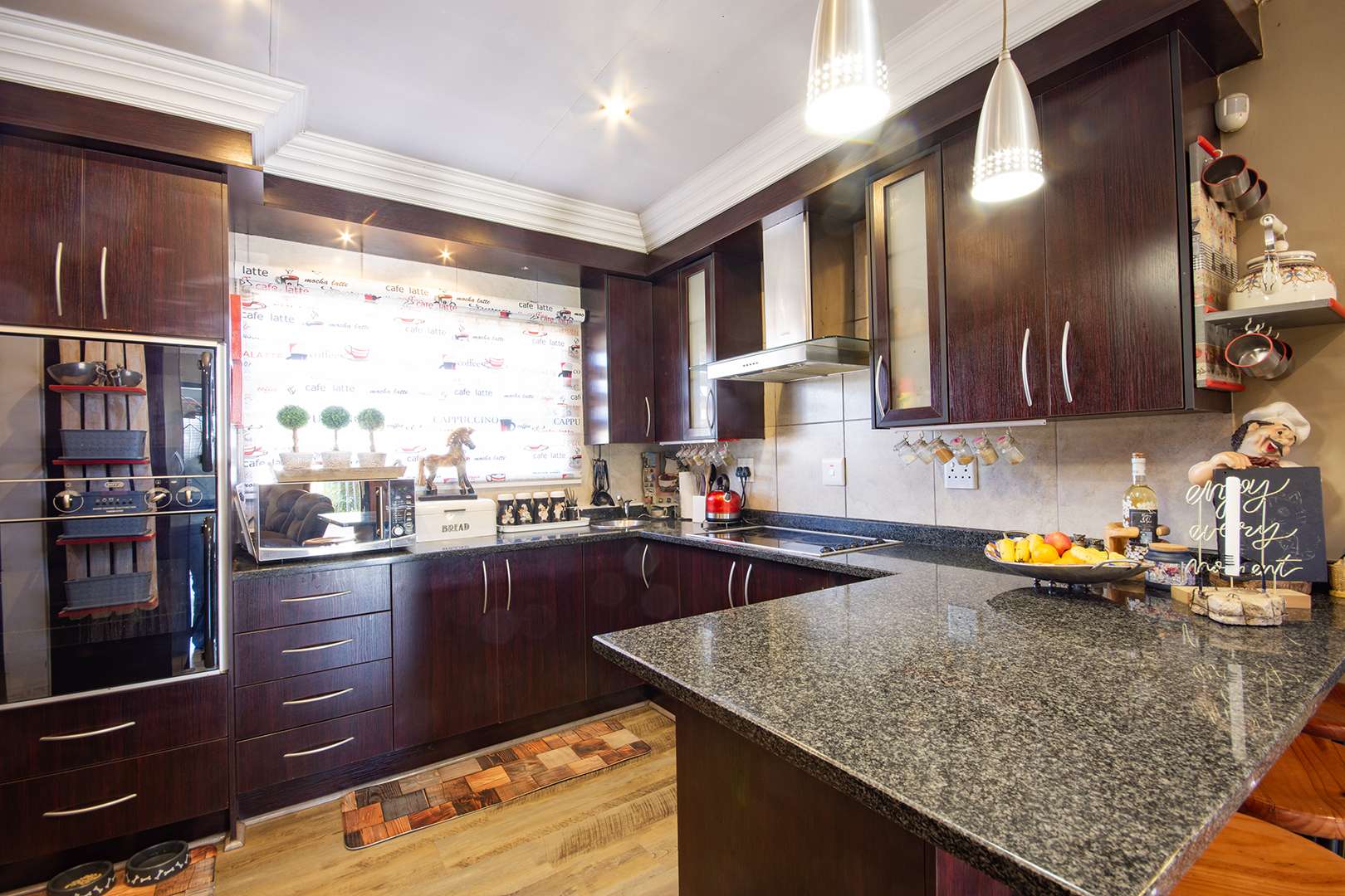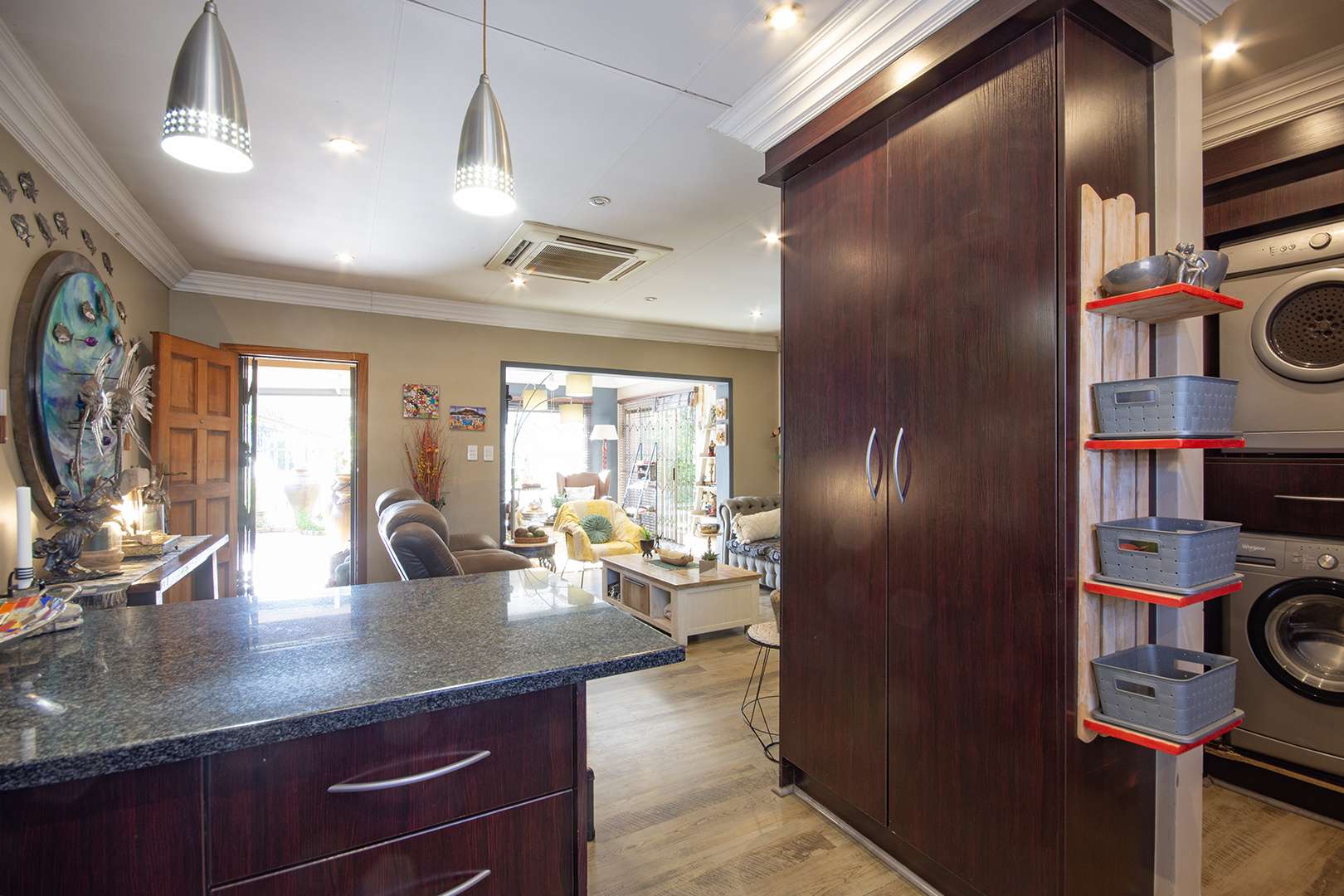 The kitchen is both functional and inviting, fitted with ample cupboard space, modern finishes, and quality countertops that make meal preparation a joy. Offering a stove, double eye-level oven and a separate scullery with 2 wet connections and a clever solution for a tumble dryer. A handy breakfast nook adds a casual dining option and overlooks the heart of the home. The braai room is adjacent to the spacious living room and has a built in braai and sliding doors leading to the cosy outside patio.