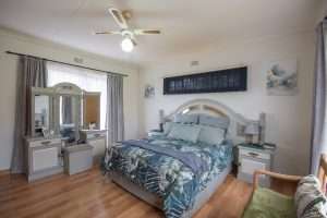 All four bedrooms are fitted with built-in cupboards, ceiling fans, and laminate flooring. The main bedroom includes an en suite bathroom. The first bathroom offers a bath, shower, WC, and single basin, while the second en suite bathroom includes a shower, WC, and single basin.