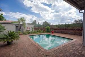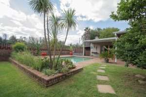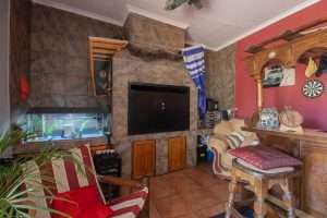The braai room is a standout feature, complete with its own kitchenette, bar area, and tiled floors, flowing out to a covered patio overlooking a marbelite swimming pool—perfect for entertaining.