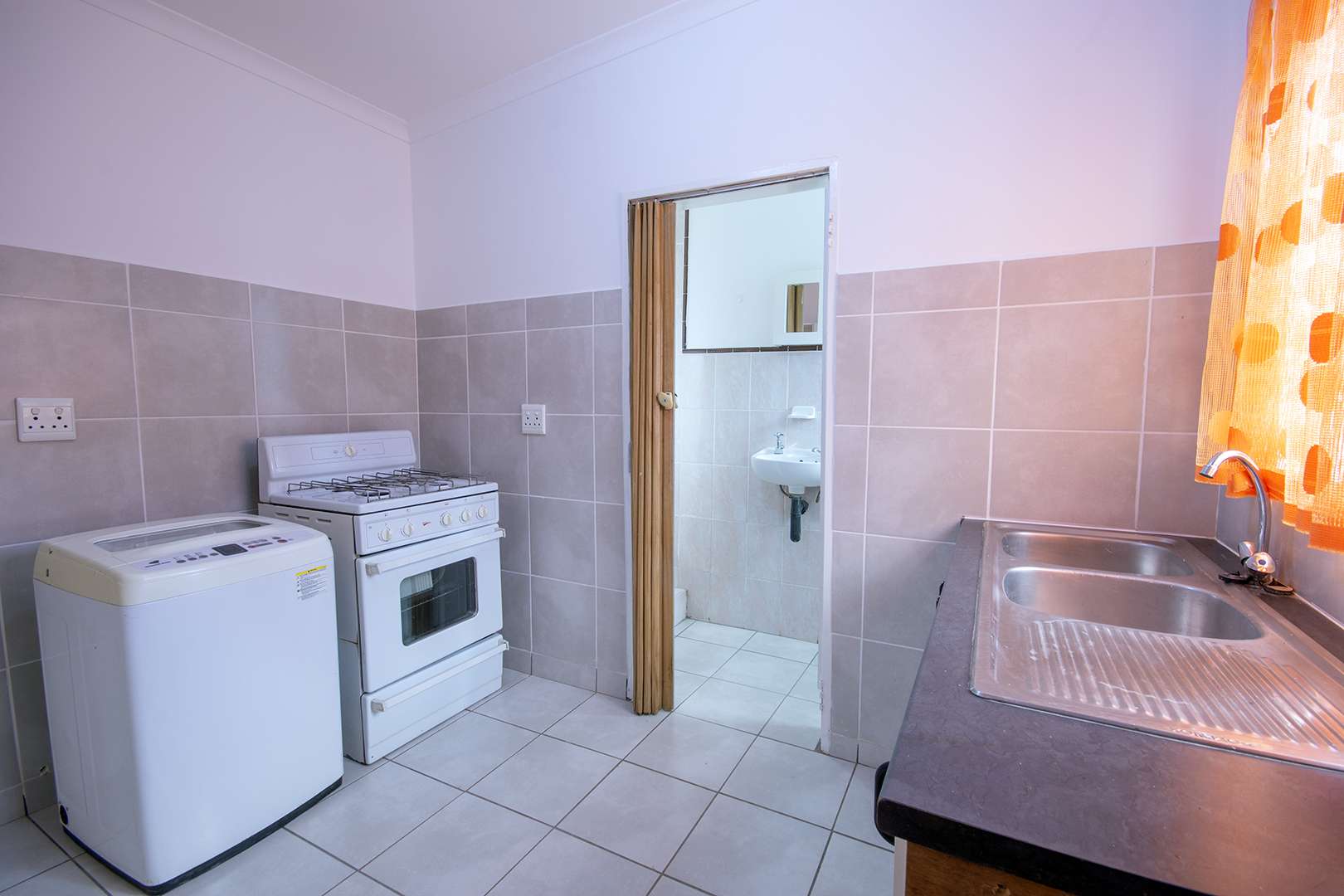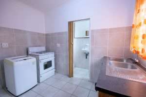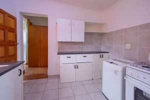 The kitchen is neatly tiled and fitted with melamine countertops, a double sink, and connections for a washing machine, dishwasher, and tumble dryer. The stove will be replaced with a full electric oven and hob, adding further value.