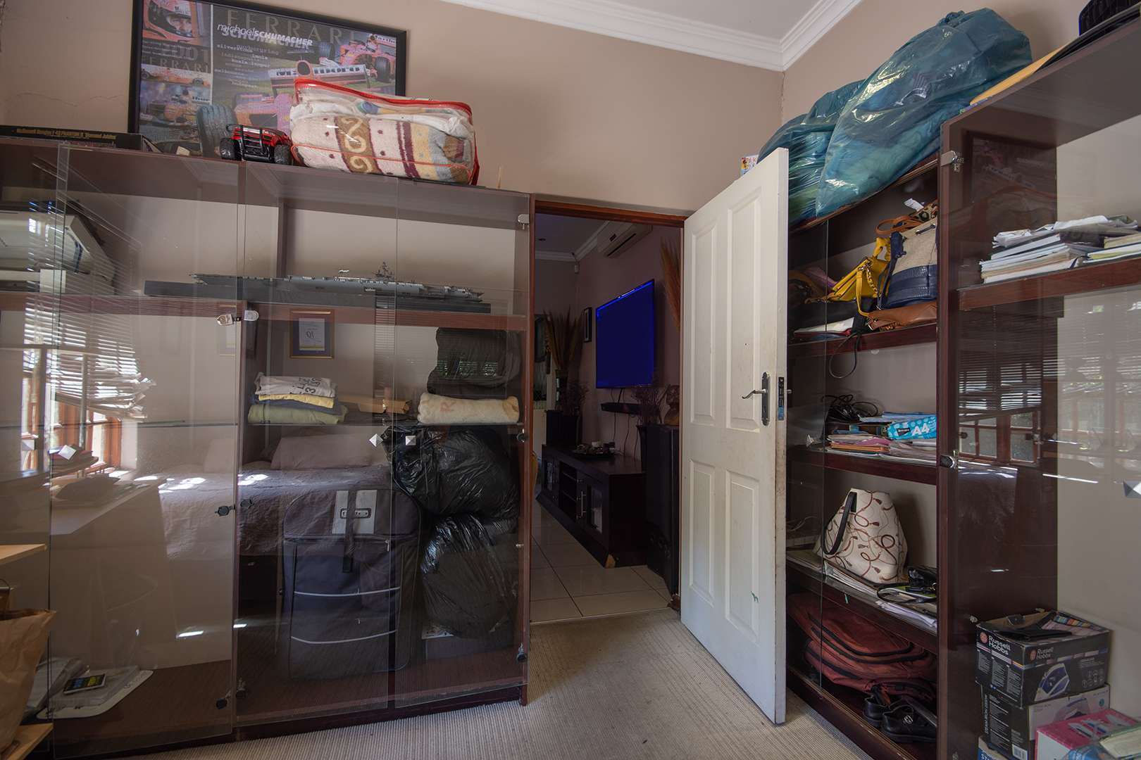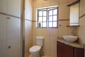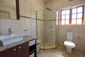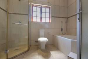 The home offers three well-sized bedrooms, all with built-in cupboards and laminated flooring. Two bathrooms serve the household, one with a shower, and the main en suite featuring both a bath and a shower. A large linen cupboard in the hallway adds valuable storage space.