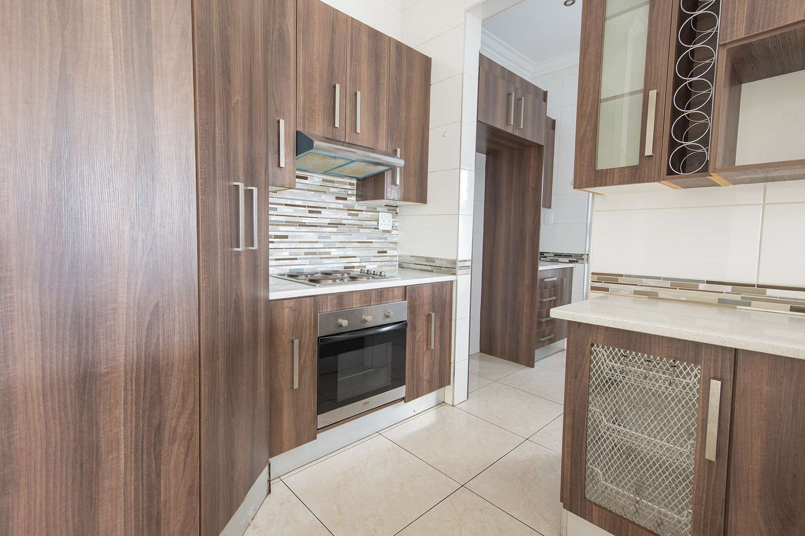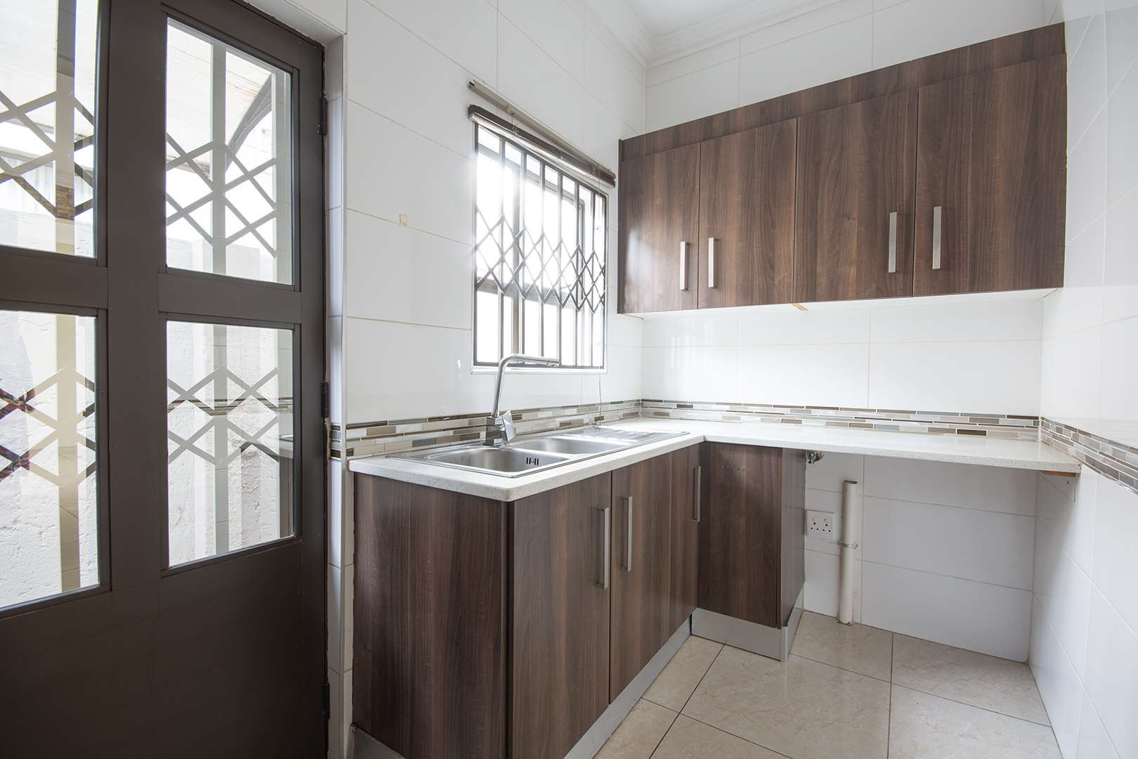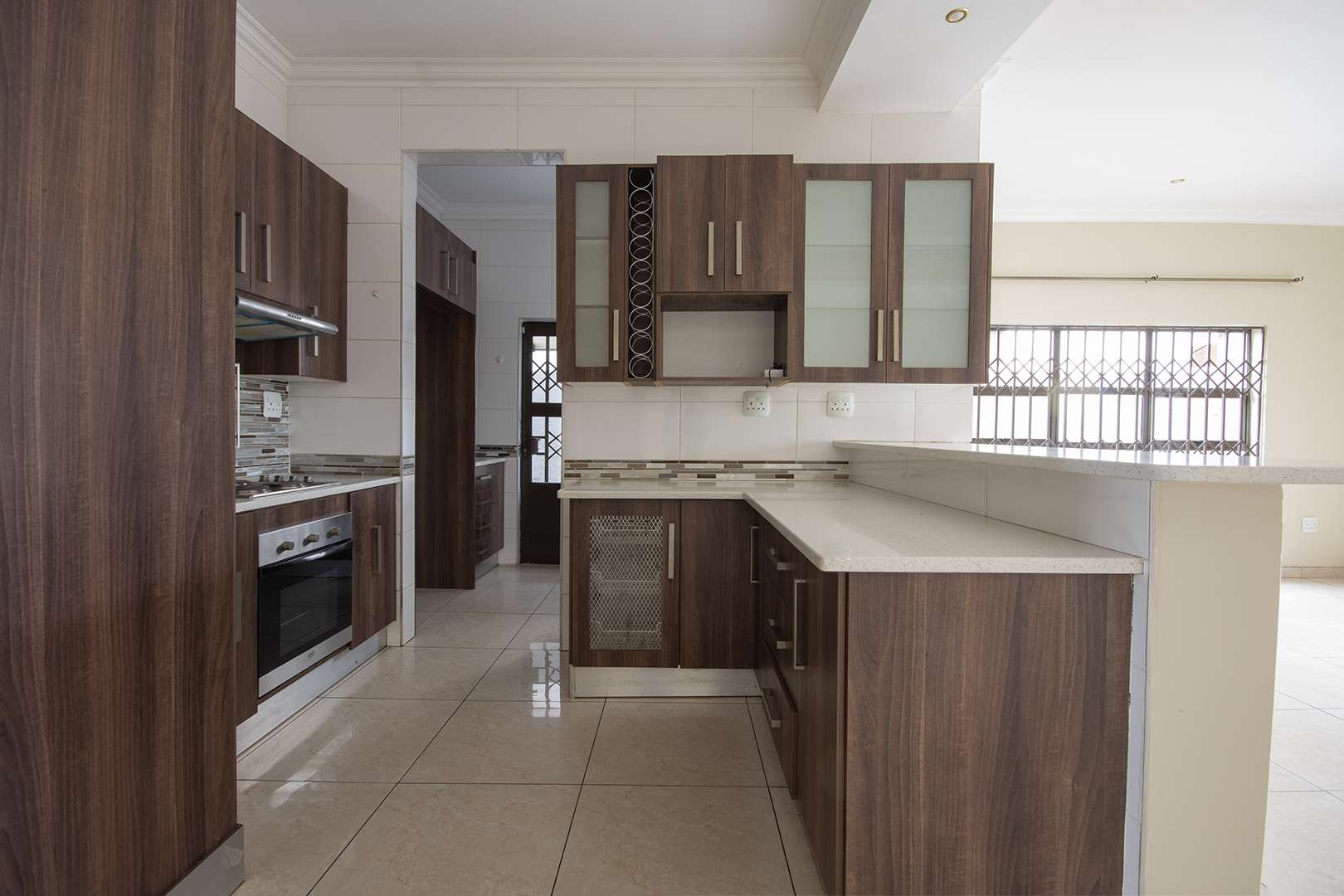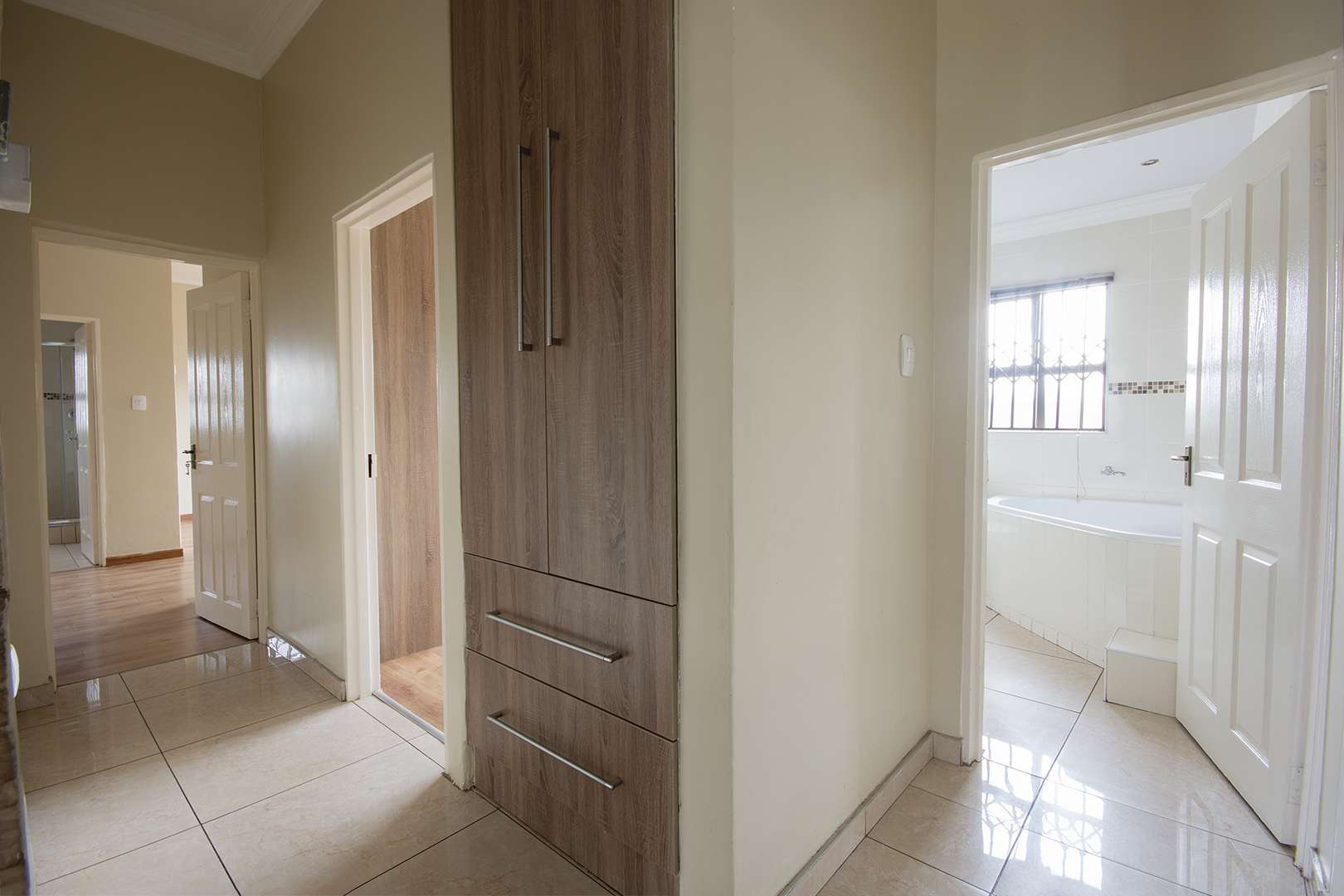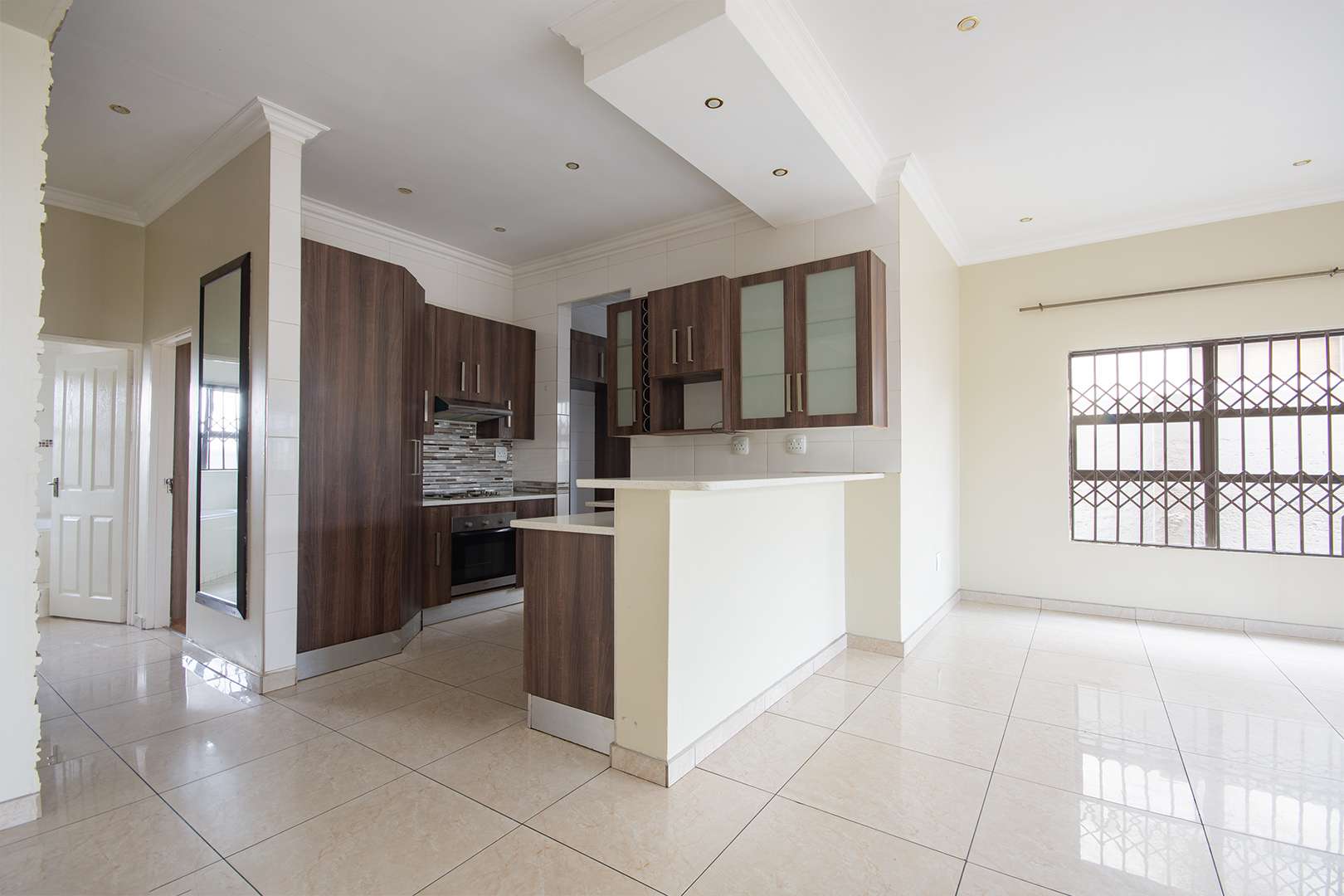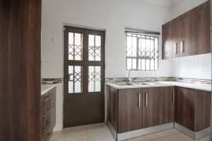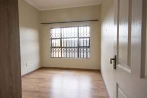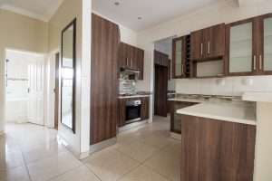 There are two bathrooms, each equipped with a bath and shower, with the main bedroom enjoying the added convenience of a main en suite bathroom. The kitchen is functional, fitted with granite countertops, ample built-in cupboards, and a separate scullery with space for a washing machine.