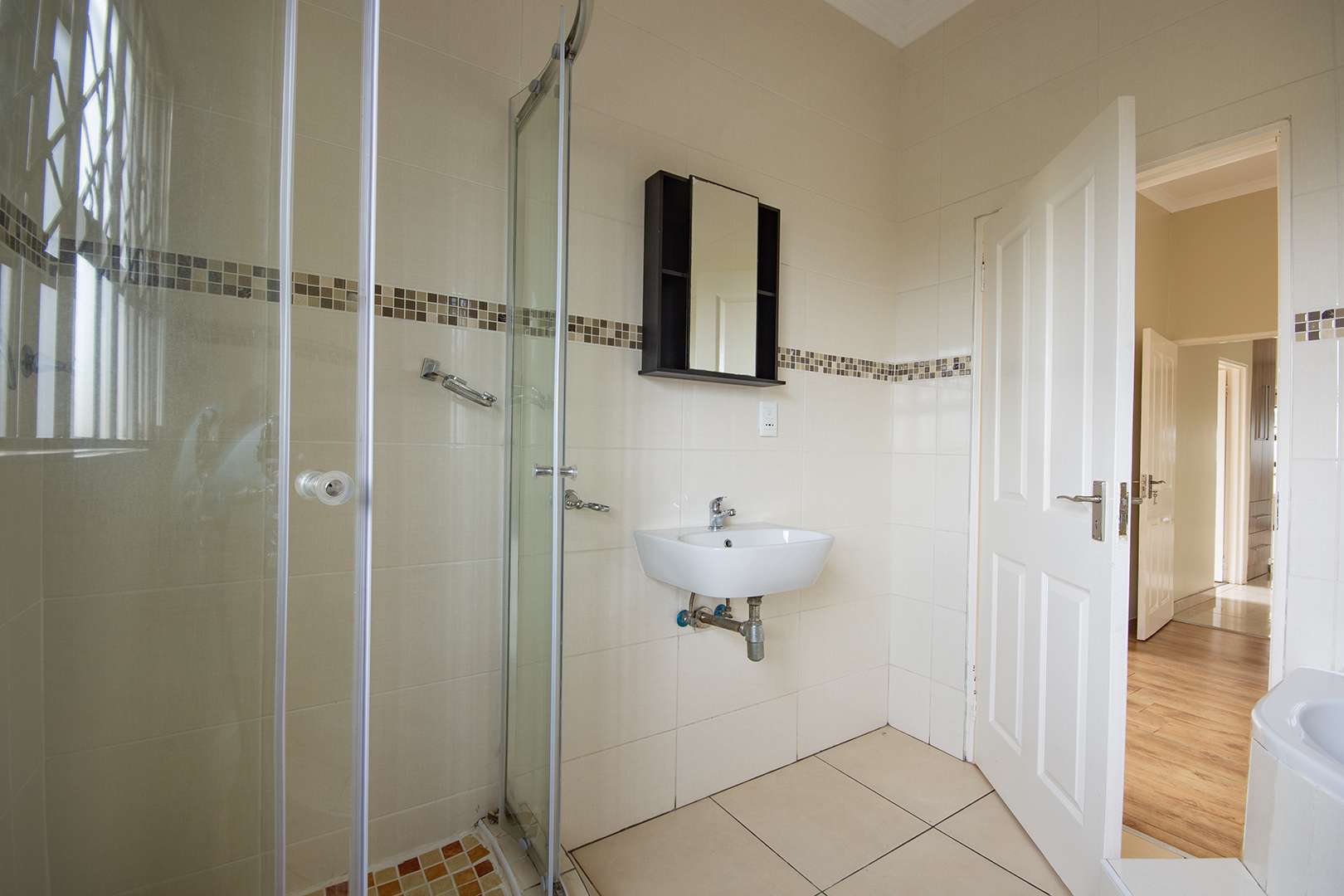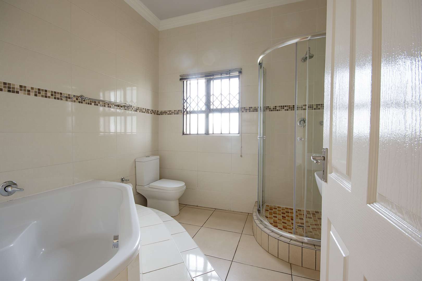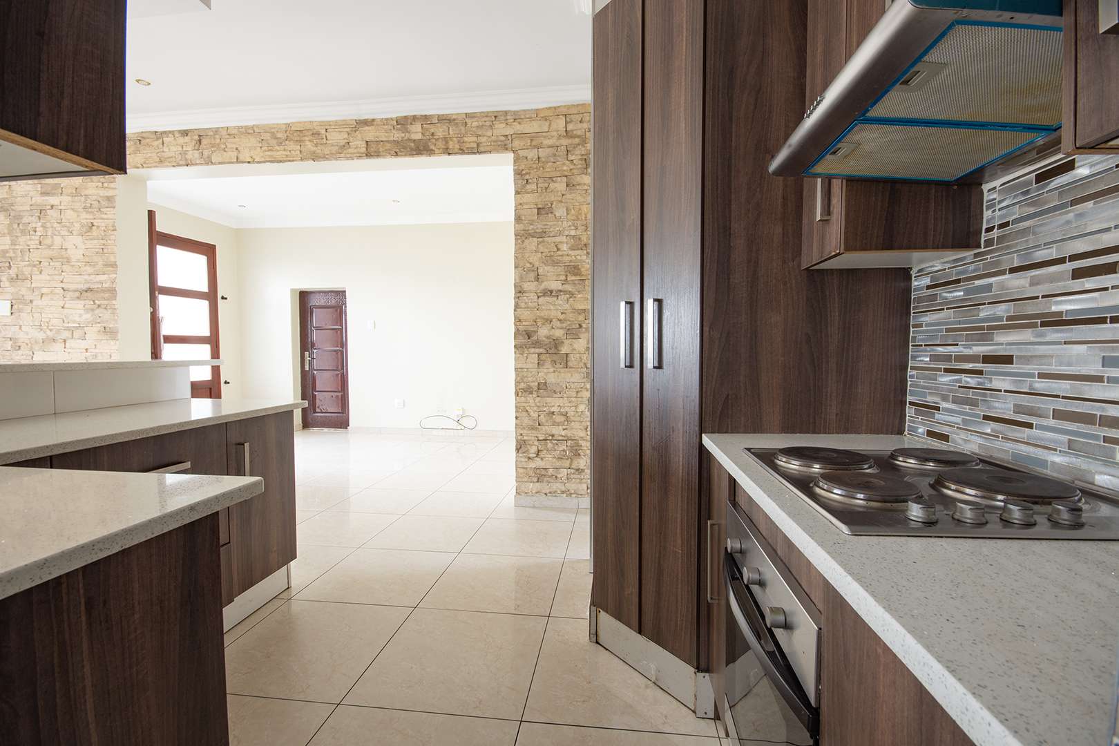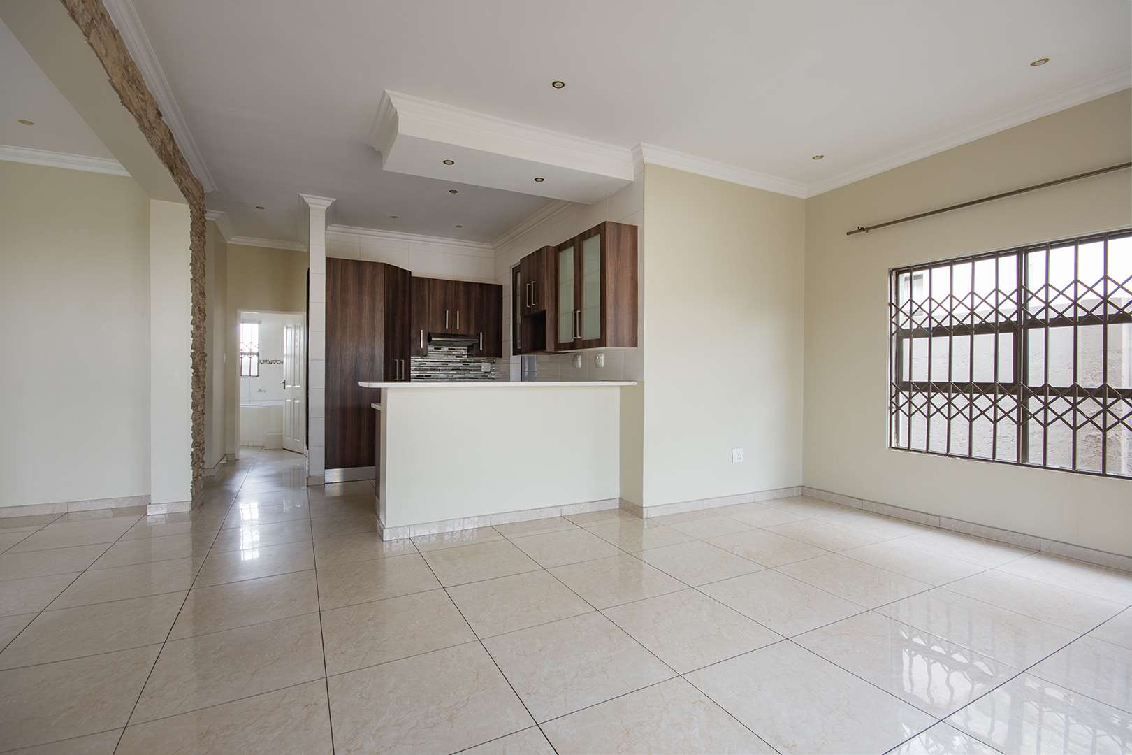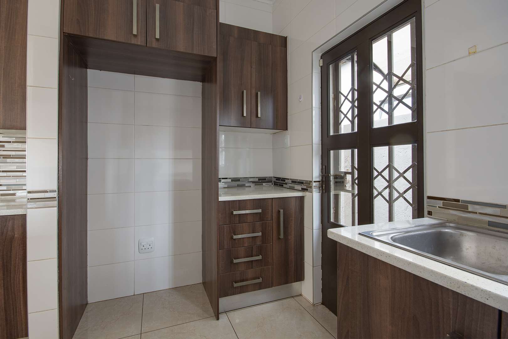 There are two bathrooms, each equipped with a bath and shower, with the main bedroom enjoying the added convenience of a main en suite bathroom. The kitchen is functional, fitted with granite countertops, ample built-in cupboards, and a separate scullery with space for a washing machine.