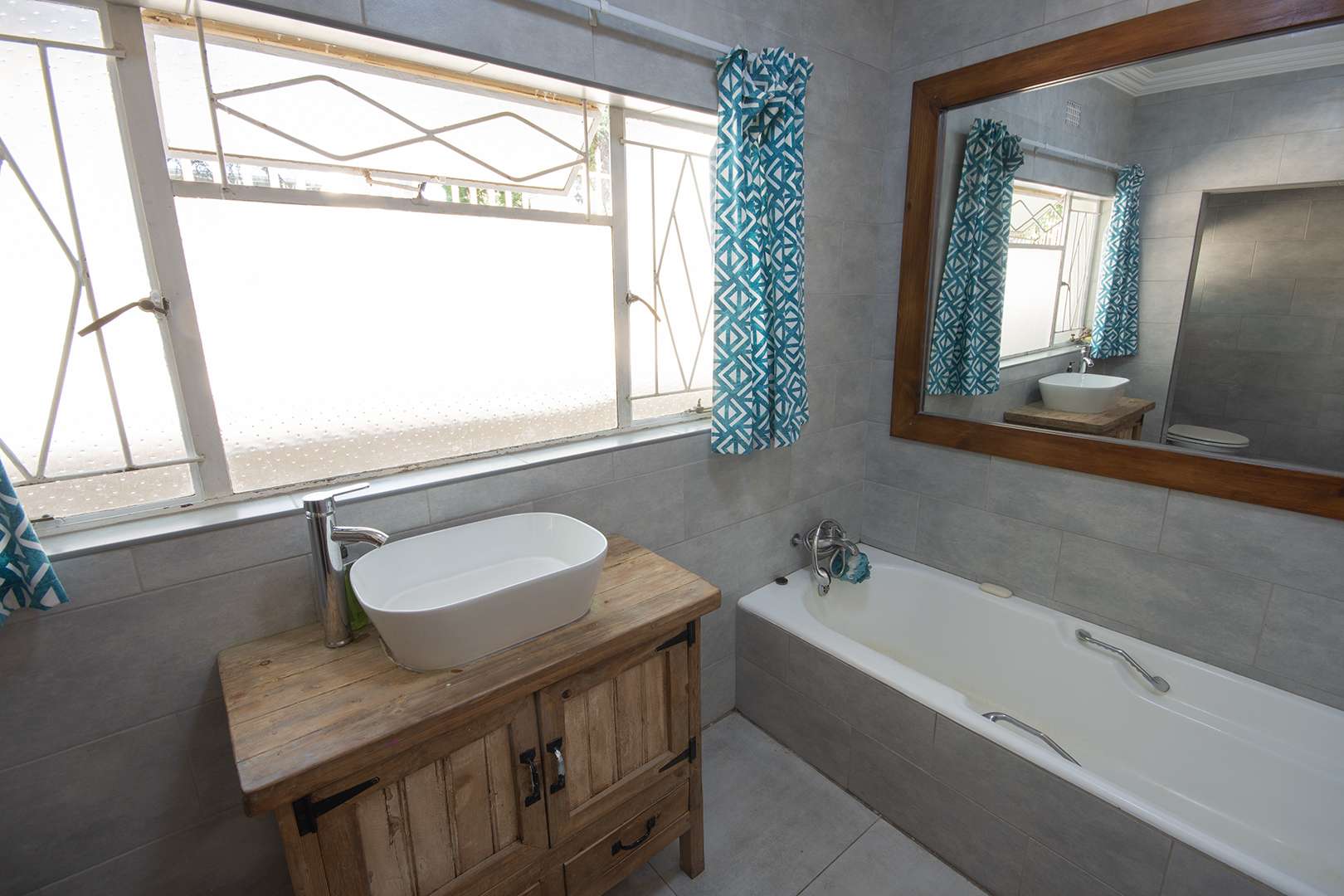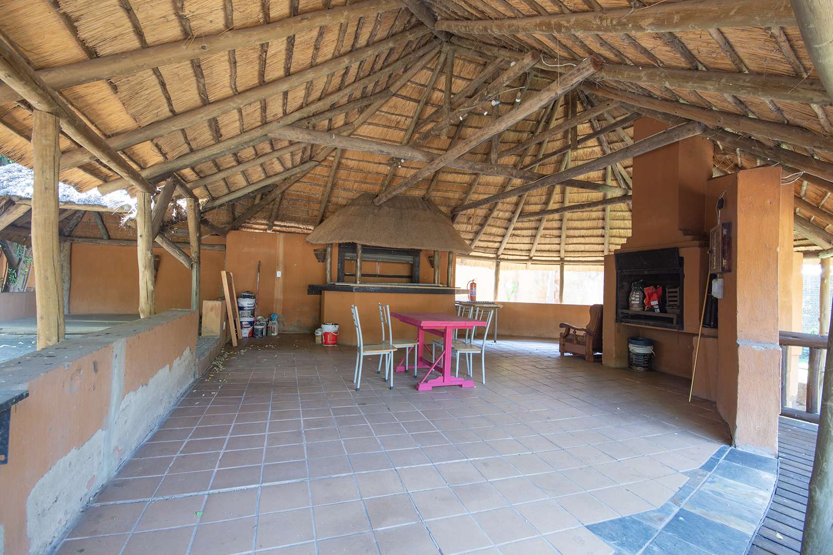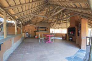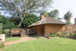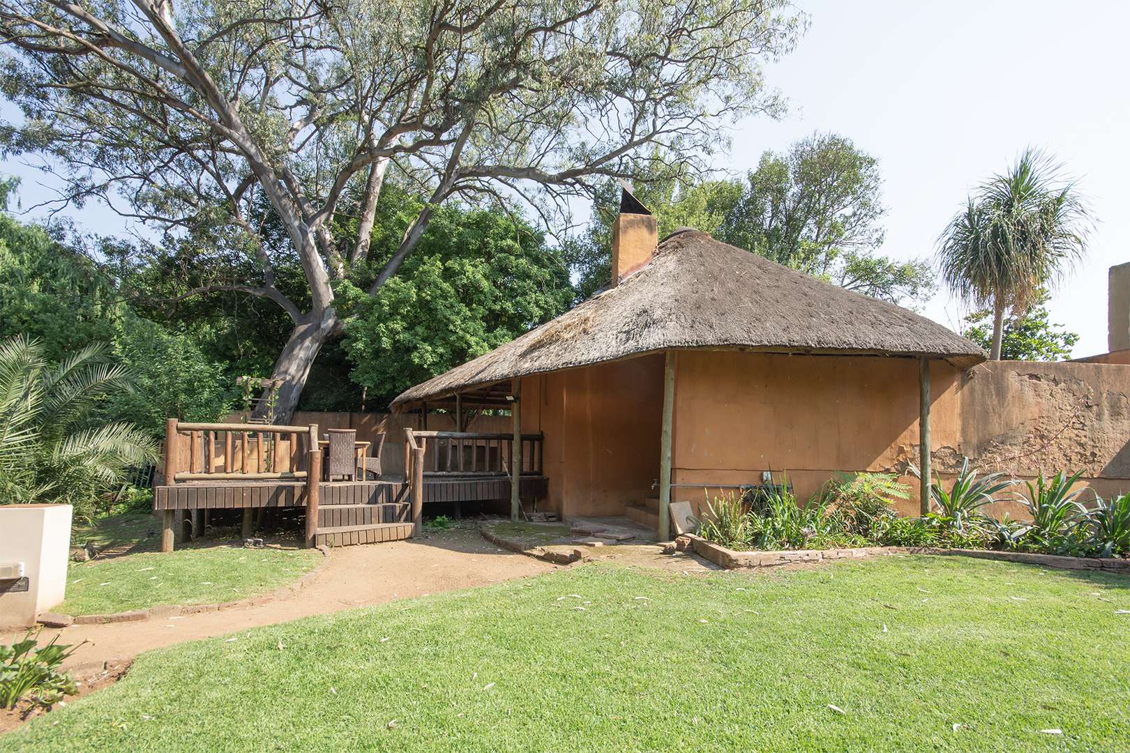 A charming wooden bridge leads to an entertainer’s dream—an expansive thatched lapa with built-in braai, bar, jacuzzi, and wooden deck overlooking the tranquil garden.